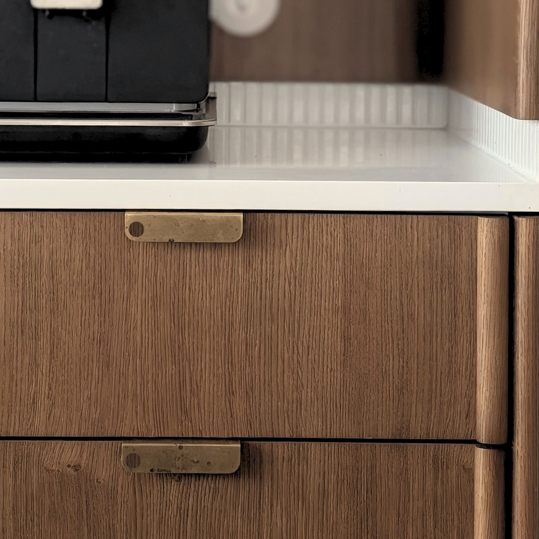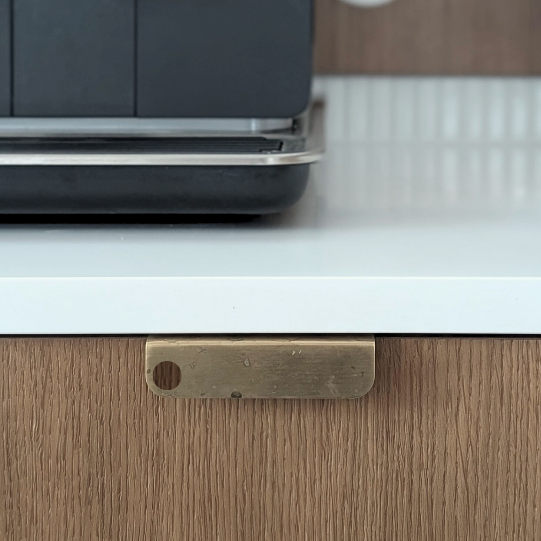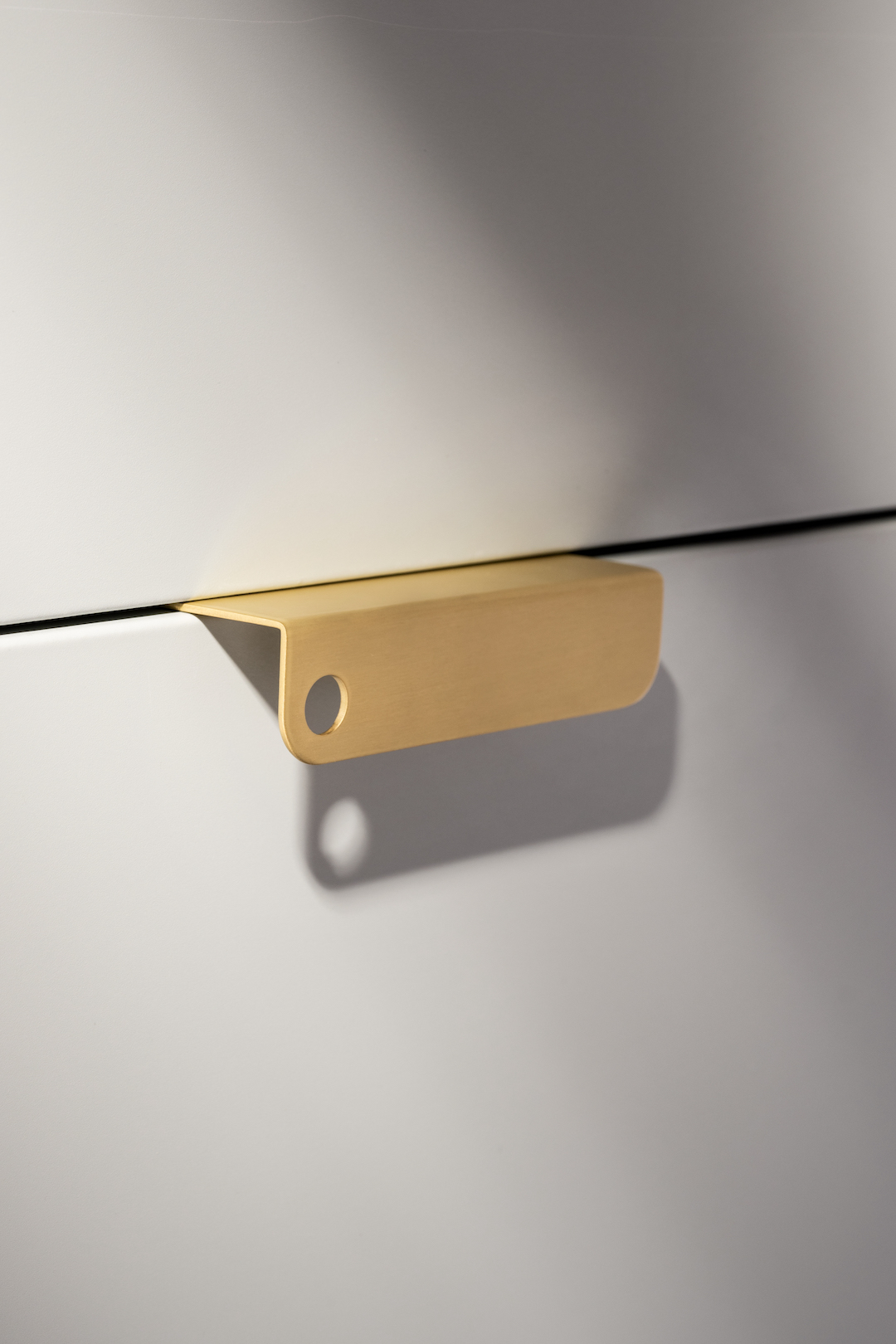 This edge handle complements the Edit collection. Made from brushed brass, it will patina and change colour over time. The simple hole in the handle is an invitation for the buyer to play with it. With it, the handle can be decorated as desired to match the character of the interior. The Edit O edge handle in combination with the Edit handle make a great pair. The handle will work well in cabinets and drawers with both classic and minimalist fronts.