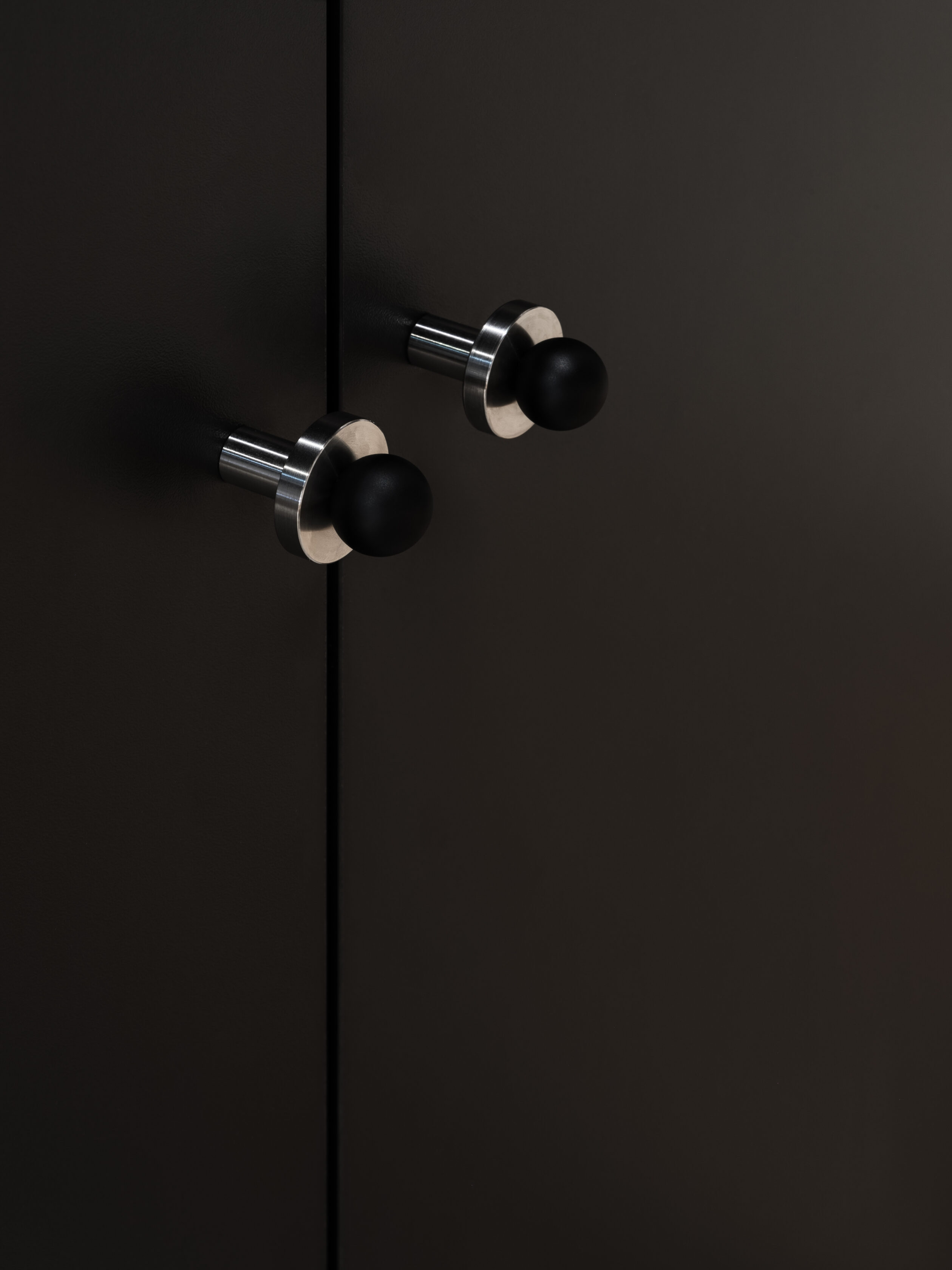 Knob POLA SILVER-BLACK is made of two elements – a base made of stainless steel and a brass ball lacquered in satin black. The Pola knob will work best for cupboards and kitchen cabinets, but can also be mounted on the wall as a hook. It will bring a breath of freshness and modernity to the interior. Knob POLA SILVER-BLACK does not patinate. Pola can be configured in any colour. The Pola collection is complemented by the Pola Slim Long handle.