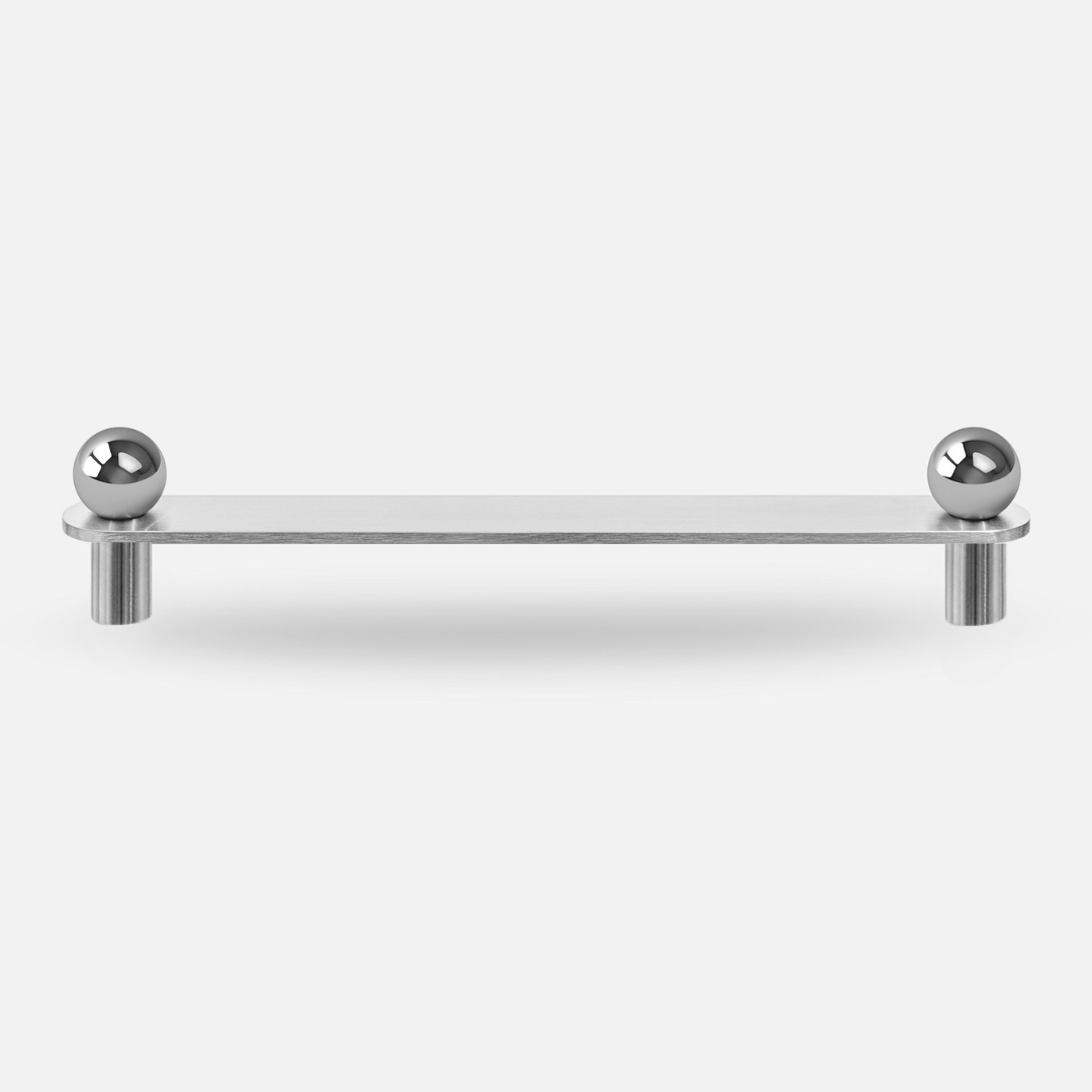 Le détail distinctif du modèle : deux boules chromées à haut poli, qui soulignent le contraste raffiné des textures (mat du brossage + brillance du chrome) et allègent visuellement l’ensemble. Le profil de la POLA LONG SILVER 185 offre un passage confortable et des arêtes adoucies pour une prise sûre, même sur des façades plus lourdes. Elle s’harmonise avec les laques blanches, les placages naturels et les façades sombres mates — parfaite pour les styles contemporain, modern classic, japandi et loft.