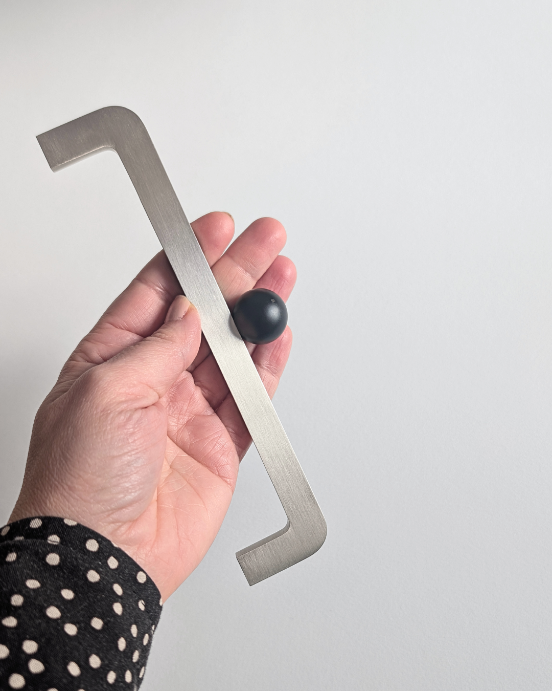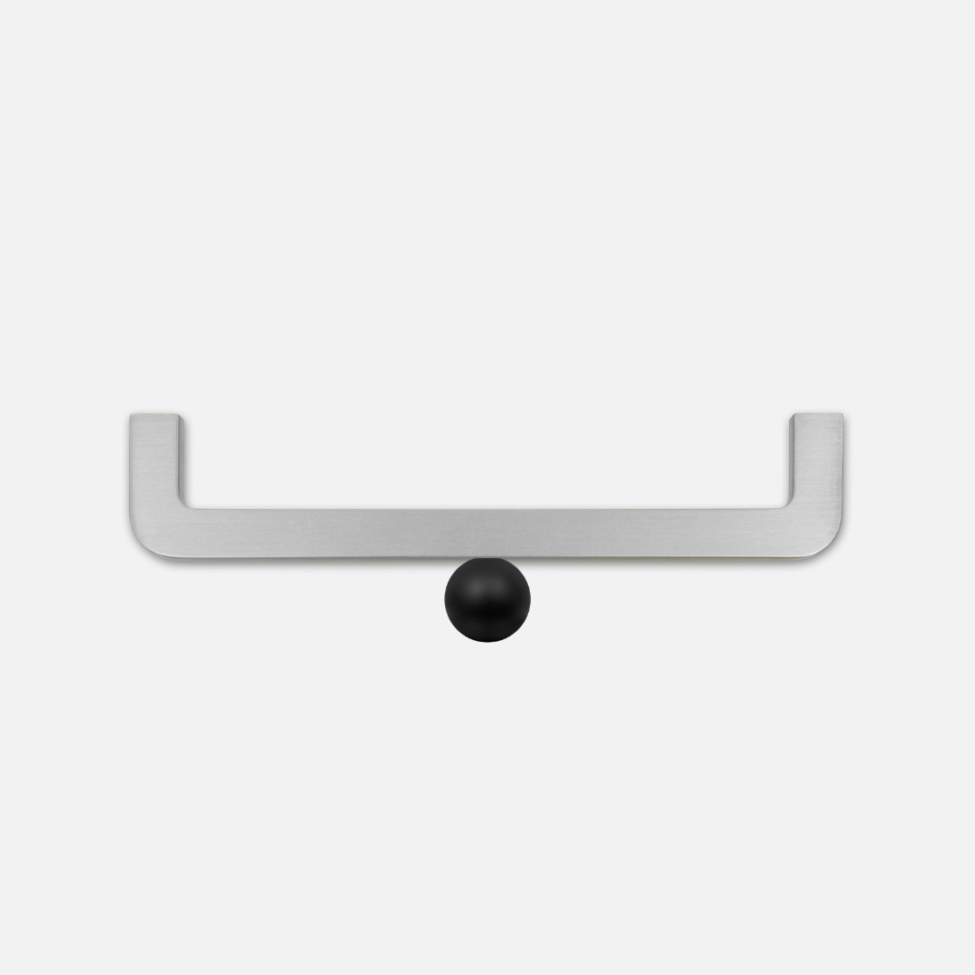 Charakterystycznym elementem modelu jest dekoracyjna kulka BLACK DOT w głębokiej, lakierowanej czerni, która wprowadza mocny, graficzny akcent. Kontrast pomiędzy satynową powierzchnią szczotkowanej stali a intensywną czernią kulki nadaje uchwytowi nowoczesny, designerski charakter i podkreśla jego biżuteryjną formę.