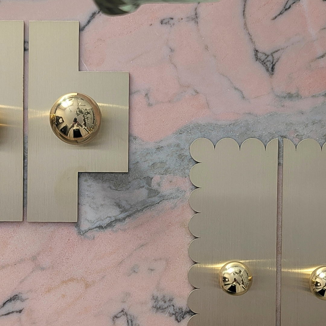 Zestaw wykonany jest z litego, szczotkowanego mosiądzu nielakierowanego, który z czasem naturalnie patynuje, zyskując indywidualną głębię i szlachetny wygląd. Centralnym punktem kompozycji jest gałka ODETE 30 (M) w polerowanym wykończeniu, której lustrzana powierzchnia odbija światło i otoczenie, wprowadzając do projektu elegancki, świetlisty akcent. Gałka jest lakierowana.