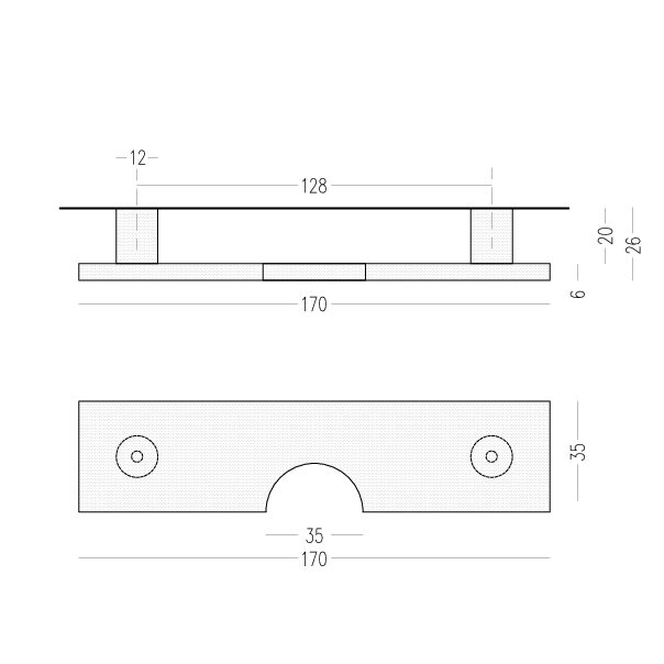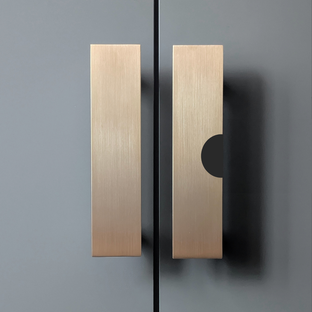 Forma uchwytu LIV DOT 128 opiera się na czystym, prostokątnym kształcie o wyważonych proporcjach, przełamanym charakterystycznym, półkolistym wcięciem w bocznej krawędzi uchwytu. To właśnie ten detal nadaje mu indywidualny rytm i otwiera możliwość personalizacji. Geometryczna prostota pozostaje tłem dla dialogu formy i dodatku — spokojnej bryły mosiądzu oraz wyrazistego punktu.